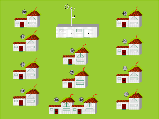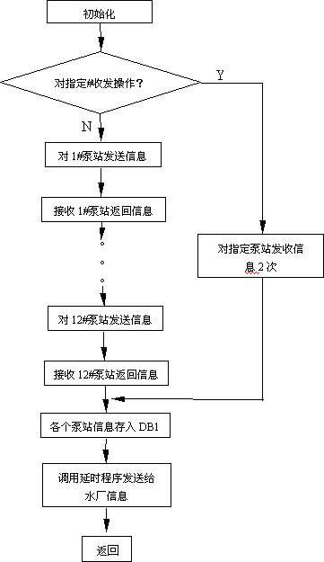 水源地控制室必须不断地保持与12个井的通讯联系,要求速度尽量的快。通过无线电台接收分散的12个井的液位、压力、流量、电机状态及电磁阀信息,传送给上位机,通过无线电台发送至水源地主控室,主控室操作员设置对12个井的控制信号,包括电机的开关、调速等信息,通过无线电台发送至各个泵站,实现远程无线遥控。主站向每个井发送20个字节,从每个井接收20个字节。