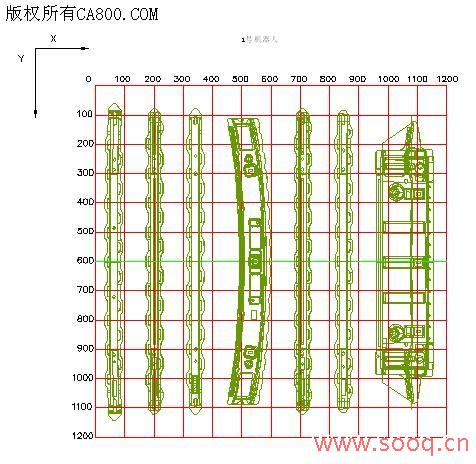 此系统是来实现汽车的顶棚横梁和发动机盖的不同型号工件的涂胶工作,首先根据胶枪的重量来选择机器人系统的负载能力,一般来说,此种胶枪的重量不会很重,所以只要选择轻负载能力的导轨系统即可。但是由于工件的数量比较多(从图3可以看出此系统是完成7种工件的涂胶和点胶的工作),涂点的数量也很多,这就要选择一个高速的涂胶系统,而这正是导轨系统所具备的特性(导轨系统可以实现最快10m/s的高速精确定位)。这样根据工作频率的要求即可选出电机的配置。最后根据工件的布置情况来选择导轨的有效行程(工件的布置情况如图3,有效行程为1200mm*1200mm*300mm)。