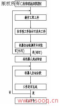 系统还设有紧急停止按扭,可手动、自动停止;机器人支承架工作范围内装有光栅安全系统,在故障或异常情况下报警信号灯亮,系统紧急停止,在手动状态下排除报警后系统方可继续运行;有自动记忆功能,在停电或故障情况后可继续完成工作。此系统的工艺流程如图4。