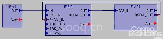以单回路液位控制为例,上位机中软件的运行情况:①HSE Init接口软件, 选择H1网段,HSE 接口程序可以与以太网段内的 HSE 设备,以及 LD 设备下的 H1 网段设备进行交互,向组态等上层软件提供数据访问接口;②运行组态程序FF-Configurator组态软件, 刷新网段获取系统的现场设备列表和功能块列表, 刷新网段后,建立应用完成功能块组态,功能块间的连线表示通过现场总线通信的信号连接,如图2所示;③FF H1和FF HSE OPC服务器, 每秒钟刷新一次,实现设备的实时数据和历史数据共享以及报警等功能; ④设计SiaView监控软件, 新建一个工程,在对象中选择PID拖到视图中,与OPC连接后经过编辑可得到一个PID功能块操作面板。