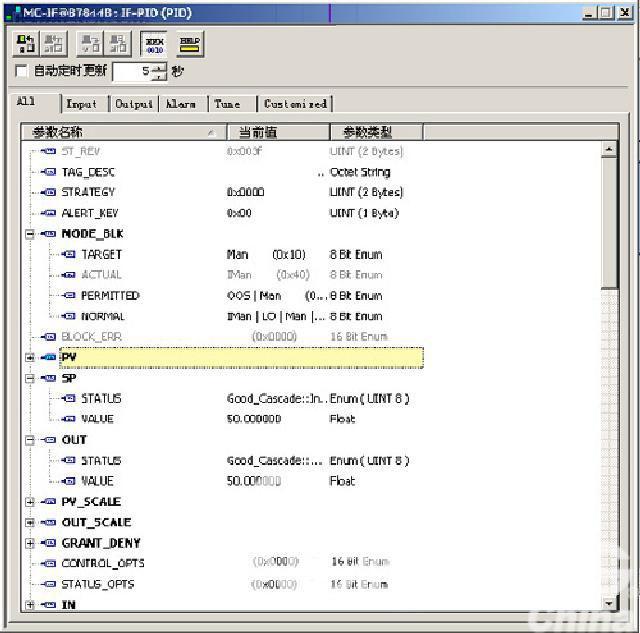 从组态软件的工程窗口的设备中选择IF-AI1功能块、IF-PID功能块和FI-AO1功能块拖拽到应用视图中连接配置成一个PID控制回路,见图2。将功能块连接,建立功能块之间的联系,使功能块之间能够进行参数值的传递并需下载组态信息到现场设备。要使液位控制回路正确运行需要修改功能块的参数值,双击IF-PID功能块,打开块的参数窗口,将IF-PID中MODE_BLK项下的TARGET参数修改成〝AUTO〞模式,读取功能块参数,从而实现单回路的液位控制自动正常的运行。如果想要实现将先进控制算法应用到FF现场总线系统的方案,只需将IF-PID中MODE_BLK项下的TARGET参数修改成〝MAN〞模式,具体设置如图3所示,然后通过OPC技术实现过程变量和控制变量的通讯。