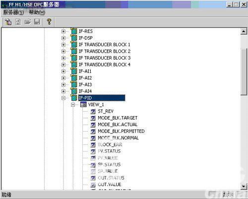 选用中科院沈阳自动化研究所提供了OPC服务器MicroCyber .FFServer.1,服务器的地址空间由服务器可读写的所有数据项组成,可以根据需要得到数据项的全称对其进行相关操作。图4为OPC服务器的地址空间图。使用OPC技术实现用VB6.0编写的客户端程序与OPC服务器的通讯,服务器中液位的实时值IF-