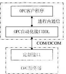 OPC客户程序通过封装的OPC自动化接口动态链接库访问OPC服务器[7],如图5所示。该动态连接库将OPC服务器的定制接口翻译成OPC客户程序希望的自动化接口,以供客户程序调用。OPC客户程序和动态链接库是进程内的通信,而动态链接库和OPC服务器的通信则基于COM/DCOM,既可以是进程内或本地的连接,