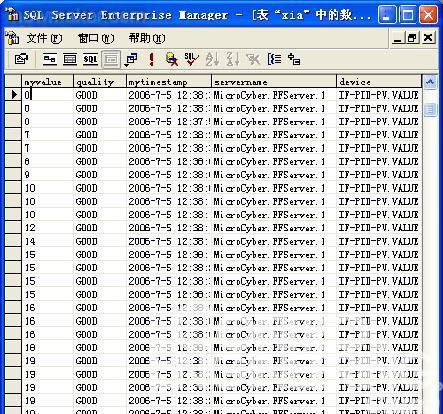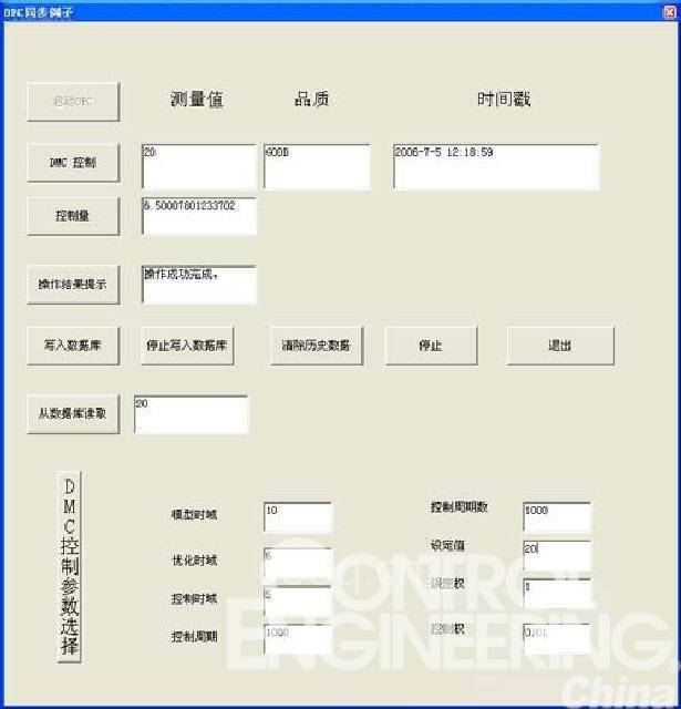 下面给出确定传递函数的参数的方法:设图7中的控制量为q,测量值为y,新的稳态值y(∞)为设定值,增益K可由输入输出的稳态值直接算出Kp=y(∞)/q,而Tp ,τ则可以用作图法确定。为了能够随时调用在OPC服务器上采集的测量值y并绘制出相应的阶跃响应曲线,这里把选择的数据存放在指定的数据库中(采用SQL2000数据库)。同时也是为了在进行算法的仿真的时候,既可以从历史数据库中取数据,也可随着数据的采集,可以不断刷新数据,进行算法的优化,如图8。