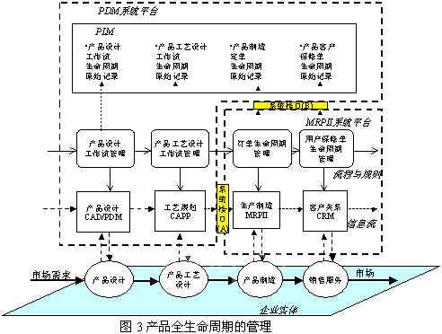 图3是在pdm操作平台上建立plm系统的。由于mrpii与pdm是两个不同的信息系统因此在这里要通过pdm的系统接口(b)连接制造信息后形成完整的产品生命周期的信息。