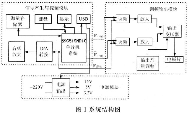 基于嵌入式器件89C5lSNDlC的电子治疗仪系统硬件结构如图l所示,分为信号产生与控制模块、调频输出模块、电源模块3部分。