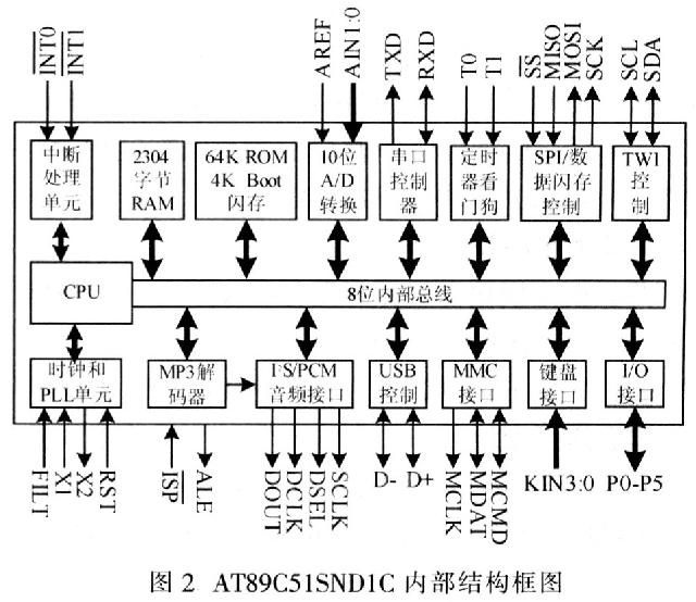 嵌入式器件AT89C5lSNDlC集CPU、MP3解码器、USB控制器等器件于一体。AT89C51SNDlC不但具有51系列单片机的控制功能,并可扩展为MP3及U盘,采用PLCC封装,其内部结构框图如图2所示。