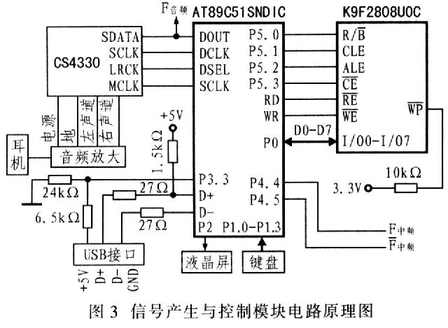 信号产生与控制模块电路原理框图如图3所示。为实现MP3及U盘功能,AT89C51SNDlC单片机需外接一个NAND—Flash海量存储器,这里选用16 MB的K9F2808U0C,其数据线I/00~I/07接P0端口,控制线接P5端口。MP3音频解码输出信号,而该单片机的DOUT、DLCK、DSEL、SCLK引脚接D/A转换器CS4330,经过放大,输出到耳机收听MP3播放的歌曲。液晶屏接单片机的P2端口,与键盘相配合以显示当前治疗仪的工作状态。键盘上有4个按键,“音量/歌曲/定时”功能键接P1.0引脚,分别与P1.1引脚所接的“next”键和P1.2引脚所接的“previ—OHS”键相配合,实现音量调节、歌曲选定、治疗定时等功能设定;而“启动/停止”键接P1.3引脚。