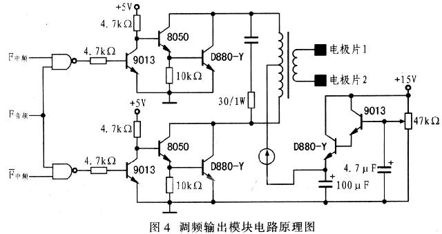调频输出模块电路原理图如图4所示。音频信号F音频分别与中频信号F中频和中频相调制,产生两个相位相反的调制波形,再经9013、8050、D880Y放大后送至变压器的两个输入端。变压器中间抽头电压可通过毫安表所接的剂量调节电路进行调整。47 kΩ电位器即剂量调节电位器,向下调则毫安表指示的电流变小,反之变大。变压器隔离输出电压变化与输入电压同步变化。输出电压经电极片与人体接触,在人体内产生感知电流。根据理疗部位的不同以及皮肤的干湿程度不同,人体的感知电流也不一样。理疗时需要调整电位器,使理疗者感觉舒适即可。