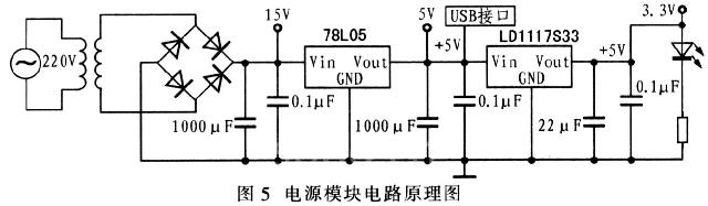 治疗仪所需3.3 V、5 V、15 V的工作电压都来自于电源模块,其原理如图5所示。3.3 V电压可提供给嵌入式器件AT89C51SNDlC使用;5 V电压可提供给调频、放大电路使用;15 V电压可提供给输出剂量调节电路。其中,5 V稳压采用78L05,3.3 V稳压采用LDll17S33。当使用U盘功能时,治疗仪的USB端口插入电脑的USB接口,不接220 V的交流电源,单片机工作电压则由USB接口提供。