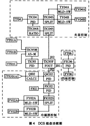 聚合反应开始后.内冷挡板中冷水流量逐渐增加,流量上升到最大经济流量.并且在整个放热过程中始终以此恒定的流量散热。在聚合反应初期,釜顶冷凝器未投用,主要通过夹套使聚合釜的温度与设定值相近,当达到冷凝器投用条件后,投用冷凝器。冷凝器的设定值以一定的变化率向上爬坡(RAMP),冷凝器流量控制器打开循环水流量阀,达到规定的最大设定值。这时.夹套的温度控制调节阀打串级(简称CAS)。反应进行至此,釜顶冷凝器的散热量也是固定的。整个聚合反应主要靠调节夹套温度进行温度控制。在整个聚合反应过程中,批量程序实时地根据不同的情况进行PID调节.确保反应温度平稳。DCS组态功能如图4所示。
