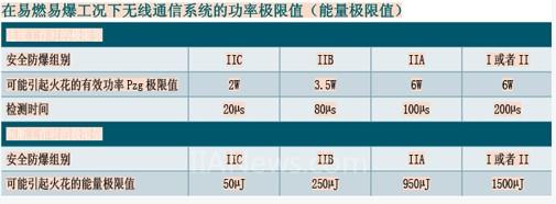 在有易燃易爆危险工况下的无线通信系统,会因电磁波发射而引起火花。强大的发射电流给现代化的发射功率带来了更多的风险,如金属表面强大的表面电流或由于电子电路EMV电磁兼容性保护的不足而感应出感生电流。这些电流形成局部高温,容易引起火花。在IEEE电气与电子工程师协会进行的试验中,在发射功率达到6W时就会出现这种现象。2008年推出的IEC 60079-0标准,对在易燃易爆工况下使用的无线通信设备做出了规定。该标准涉及的相互频率范围在10kHz~300GHz。它对连续通信和间断通信时无线信号的极限值,做出了规定(参见下表)。在工业领域常用的WLAN、蓝牙及Zigbee无线网络常用的开放式ISM频段中,允许使用的无线发射功率值较低。根据无线通信技术协议的有关规定,WLAN无线通信网络中各站点的发射功率被限制在100MW之内。在蓝牙和Zigbee无线网络中,其发射功率也都被限定在10MW之内。对不超出规定限制范围做出了规定,要把所谓的天线增益也考虑在内(天线在特定方向上的发射功率的大小是天线将输入功率集中辐射的程度大小)。鞭型天线和定向天线的典型增益为5和9dBi。