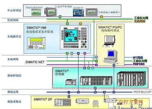 本地操作层:现场监视的工业计算机,通过各种组态软件进行各种数据采集、显示、存储,也可以对下面的控制器进行控制和设置。由于现在的控制器支持多种通讯方式,所以,本层可以大量使用运行组态工程的人机界面产品,监视运行、控制、数据上传等。同时,可以使用便携式调试设备进行控制器和人机界面产品的实时维护。比如,使用西门子的TP270HMI产品进行系统监视、控制,使用西门子便携式编码器PG产品或者装有西门子HMI软件和STEP7系列控制器PLC编程软件的笔记本(带串行口和以太网等网络通讯口),进行TP270HMI组态工程的维护和修改,同时,可以修改PLC控制器的逻辑命令,监视控制器的运行状况。