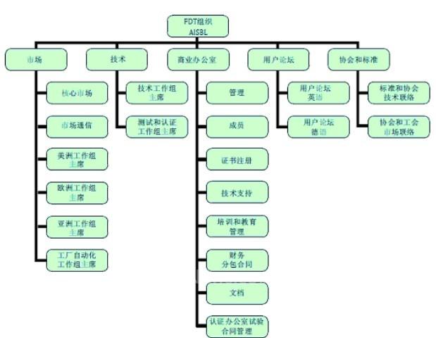 FDT组织是由国际上支持技术增值的公司组成的一个非盈利性的协会,2003年初由ABB、ENDRESS+HAUSER、Invensys、Mesto和西门子联合发起,2005年9月,注册成为“FDT组织”。FDT集团包括一个董事会(BoD),一个执行委员会(ExCOM)以及其他委员会(图1)。董事会由集团成员选举产生,执行委员会由董事会任命。工作组和项目组也是委员会的一部分,工作组是长期的机构。每个工作组都详细地定义了各自的任务和职责范围。工作组的领导对国际团队进行管理,工作组成员通过会议或电话会议进行交流。执行委员会可以指定特定技术项目(如特定协议)的项目组。项目组从属于工作组并且只在预定的项目结束日期之前存在。组织由会员大会选举出的理事会领导。理事会制定组织的战略,并指定执行委员会负责日常运行工作。
