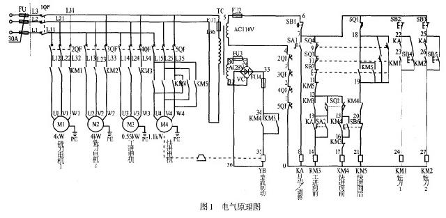 根据加工的工艺要求,该双端面铣床电气上采用继电器控制。设计出能满足技术要求的电气原理图,如图1所示。按钮旋钮以及限位开关的功能见表1。铣刀 1、铣刀2、机械滑台的快进、工进、快退由四台异步电动机拖动。其中机械滑台的快进、快退由M4电动机正、反转控制实现。电气工作原理主要介绍如下,如图 1所示。