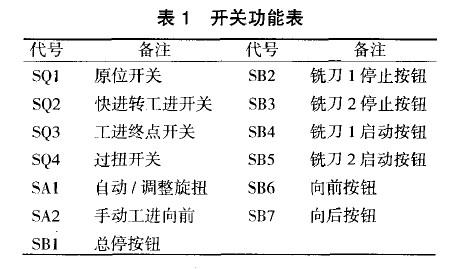 手动调整状态时,KA断开,按下SB4,KMI得电,铣刀1电机工作;松开SB4,KM1失电,铣刀1停止。这时SB4是铣刀1电机的点动按钮。同样,按下SB5,铣刀2工作;松开sB5,铣刀2停止,这时SB5是铣刀2电机的点动按钮。