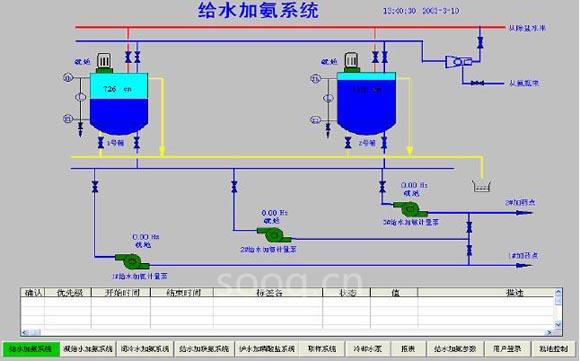 (1) 工艺系统图:该画面通过编程实现动态模拟显示化学加药系统的药品配制及投加过程。对整个生产过程中的计量泵、搅拌器等设备的手动、自动控制,并完成对加药处理过程中的水汽参数的在线监测功能,对生产过程中的反馈信息做出及时的分析处理,组态图参见附图。