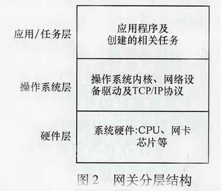 网关的设计过程中,自上而下分为三层:应用/任务层、操作系统层和硬件层。分层结构如图2所示。
