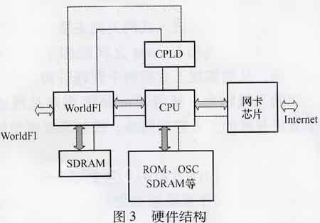 硬件层设计主要包括选择合适的芯片及进行原理设计。在本设计中,选用Samsung公司的ARM 32bits芯片s3c451Ob微处理器,它的运行速率为5OMHz,带有Ethernet控制器;网卡芯片使用ICS1890;WorldFIP侧选用的芯片是符合WorldFIP现场总线协议的专用芯片(Fullfip2、FIPDUAL等);CPLD选用ALTERA公司的EPM7128SLC84,主要用于s3c4510b和Fullfip2之间的时序匹配和逻辑组合;SDRAM选用Hynix的HY57v64323220,主要用于任务堆栈和中间变量;flash选用SST的39VF169,主要用于存放程序;SRAM选用ISSI的IC61C1024,主要用于存放Fullfip2的微码和中间变量。硬件结构如图3所示。