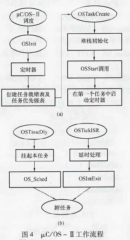 μC/OS-Ⅱ是一个开源的RTOS,其主要工作流程如图4所示。任务切换的核心是利用出栈指令将每个任务的工作现场恢复,并且调整PC指针来完成任务的切换。μC/OS-Ⅱ移值的关键就是如何构造任务堆栈及切换任务时的出栈顺序。在这个流程图中我们可以看到在移值过程中需编写的几个子程序的位置。