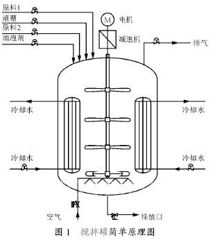 发酵工艺是产生菌种在适合的培养基、PH值、温度、通气和搅拌等条件下进行生长与合成的代谢活动。发酵工艺的持续时间与发酵液内氧的传递能力、营养物质的消耗程度、有毒性和有抑制性化合物的形成及菌种的物质特性有关。其中通气和搅拌功能是给产生菌提供生长代谢活动的氧源,而搅拌器的功能则是在发酵液通气的条件下,将空气打碎成小气泡,使其均匀分布在发酵液的各个角落,增加气液接触的有效面积,使发酵液随搅拌叶转动形成涡流并提高其湍动程度,以减少菌丝因缺氧而产生结团现象,使氧的传递面积增大,延长氧在发酵液中的停留时间,达到增加产量的目的。搅拌罐简单原理如图1 所示。