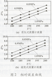 0 引言 蒸汽是工业生产过程中重要的二次能源,许多科技工作者对蒸汽流量的准确计量进行了研究,并积累了一些经验[1-3]。目前最常用的是差压式流量计和涡街流量计,并配以蒸汽密度补偿。而蒸汽密度补偿一般采用蒸汽压力、温度补偿的方法,分别由安装在管道上的压力变送器和温度变送器(pt铂电阻)来实现。流量计及其用于密度补偿的压力、温度变送器的正确安装和设定将对蒸汽流量计量的准确度带来直接的影响叫,从差压式流量计的不确定度合成中我们也可以清楚地看到这一点[5]。不同状态的蒸汽,其蒸汽密度与压力、温度的关系模型是有根本区别的。在应用中,由于忽略了蒸汽状态对流量计配套选型的要求,因而带来很大的计量误差,也因此引起了许多计量纠纷。 1 蒸汽流量测量原理 在蒸汽流量计量中,最常用的流量计是差压式流量计和涡街流量计[6]。 差压式流量计的理论依据是伯努利方程和流动连续性方程。当流体流经节流装置,使部分压力能转换为动能,产生差压信号,而这一差压与流量的平方成正比,其数学模型为:  式中:qm为蒸汽质量流量,T/h;C为流出系数;ε为可膨胀性系数;d为节流件孔径,m;ρ为节流件蒸汽密度,kg/m3; △P为节流件上下游差压,Pa;E为渐近速度系数。 涡街流量计的理论依据是流体振荡原理。流体在管道中经过涡街流量变送器时,在三角柱的旋涡发生体后上下交替,产生正比于流速的两列旋涡,旋涡的释放频率与流过旋涡发生体的流体平均速度及旋涡发生体特征宽度有关,可用以下公式表示:  式中:f为旋涡的释放频率,Hz;k为流量系数,1/L;ρ为蒸汽密度,kg/m3;υ为流过旋涡发生体的流体平均速度,m/s;d为旋涡发生体特征宽度,m;St为斯特罗哈数,无量纲,当雷诺数 Re在l02~105范围内,St值约为0.2。 从式(2)和式(4)可以看出,蒸汽质量流量与蒸汽密度直接相关。因此,常用Pt100铂电阻测量得到的介质温度信号和压力变送器测量得到的介质压力信号作为密度补偿信号,涡街流量计对蒸汽流量进行密度修正。对饱和蒸汽,蒸汽密度ρ只与压力P有关,即ρ=ρ(P);而对于过热蒸汽,蒸汽密度ρ与压力P的关系和温度T有关,即ρ=ρ(P,T)。 2 蒸汽状态对蒸汽流量计量的影响 根据蒸汽密度表[7],我们可以方便地得到饱和蒸汽密度与蒸汽压力的关系、过热蒸汽密度与蒸汽压力以及温度的关系。不同蒸汽压力下,饱和蒸汽密度与压力关系如图l(a)所示;同样在蒸汽压力为0.8MPa、0.9MPa及1.0MPa时,对于过热蒸汽在不同温度下,过热蒸汽密度、压力与温度之间的关系如图1(b)所示。  为了直观地说明蒸汽状态对蒸汽流量计量的影响,我们结合差压式流量计的数学模型式(2)和涡街流量计的数学模型式(4) ,就蒸汽状态为过热蒸汽在压力为0.9 MPa、温度为190 ℃ 时进行讨论。 从图1(b)可以得到,在压力为0.9MPa、温度为190℃时,过热蒸汽密度为ρ0=4.459 kg/m3;但如果在流量计安装中错误地把蒸汽状态判定成饱和蒸汽,则由图1(a)得到蒸汽压力为0.9MPa时,饱和蒸汽密度为ρ=4.645 kg/m3。 对于差压式流量计,把ρ0、p1,代人式(2)得: 引起的流量计量误差为: 对于涡街流量计,把ρ0、ρ1代入式(4)得:  引起的流量计量误差为: 该流量计量误差是由于蒸汽流量计安装时对蒸汽状态选择不当带来的。不同蒸汽压力、温度带来的相对误差如图2 所示。  3 结束语 蒸汽流量计可以通过温度、压力信号补偿蒸汽密度实现对蒸汽流量的准确计量。蒸汽密度补偿模式直接与蒸汽状态有关,即蒸汽状态的错误判定会给蒸汽计量带来很大的误差。蒸汽状态给差压式流量计带来的计量误差大于给涡街流量计带来的计量误差。蒸汽压力越低,蒸汽状态影响越大。因此,蒸汽流量计安装中必须正确判定蒸汽状态。