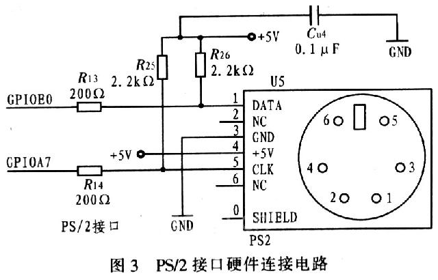 PS/2接口只需2根数据线,连接简单,图3为PS/2接口硬件连接电路。