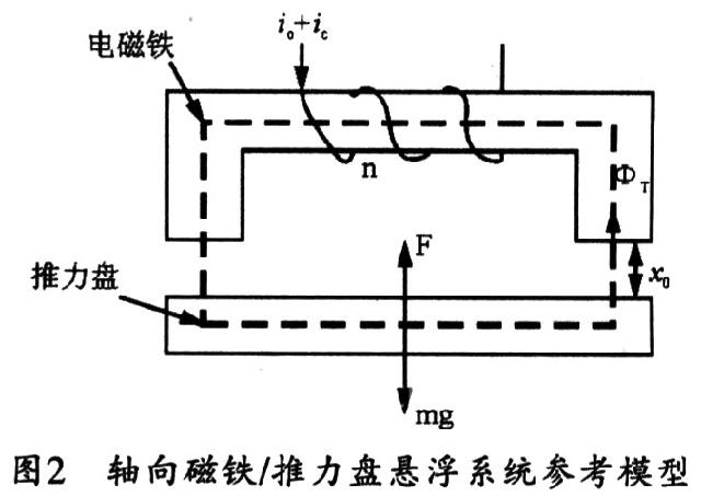 一般的磁轴承系统的结构示意图如图1所示,由图可见,轴向磁浮轴承主要借助轴向电磁铁对转子的电磁吸力来平衡转子自身的重量,同时对转子的轴向运动进行约束。轴向轴承主要承载的是转子本身的自重,属于单方向静态载荷,而其动态载荷相对较小,故可采用单边工作方式的圆盘电磁铁系统。图2为轴向磁铁/推力盘悬浮系统转化的简易结构图。图中,x0为轴向轴承在平衡位置的间隙,i0,ic分别为电磁铁线圈的偏置电流和控制电流,F为电磁铁对转子所产生的电磁力。