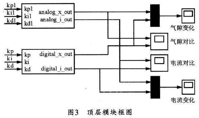 在模拟控制系统中,控制器最常用的控制是PID控制,PID控制由于其自身的优点,在工业生产过程中仍然得到了广泛的应用。模拟PID控制器主要由三个典型的环节组成,即比例环节(P)、积分环节(I)、微分环节(D)。根据上述磁轴承系统的数学模型,可在Matlab环境下采用Simulink仿真工具对磁浮轴承轴向系统进行仿真,以观察其输出响应曲线。仿真数据取自实际磁浮轴承实验装置。由于电磁轴承本身要应用到实际生产当中去,因此,和普通的电机一样,在工作过程中经常会遇到负载变化的情况。如风机、冲床和铣床等应用中存在轴向径向的加载和减载等。下面以轴向轴承为例来分析加载和减载对系统的影响。为了方便进行模拟和数字的对比,首先可建立如图3所示的顶层模块,其中模拟控制系统仿真框图如图4所示,数字控制系统的仿真框图如图5所示。