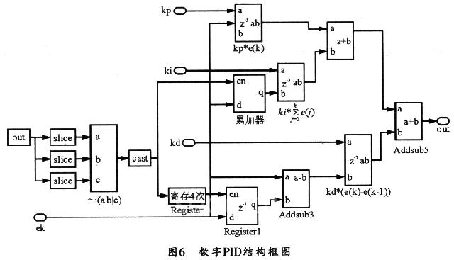 在本系统的仿真中,其数字PID使用xilinx提供的模块集(blockset)构建而成,如图6所示。