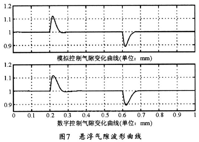 加载/减载可使用Flux*来描述,用以表示在0.2 s和0.6 s时刻阶跃加载和减载400N。其仿真结果如图7所示,所得到的悬浮气隙波形曲线中的上方为模拟控制,下方为数字控制。
