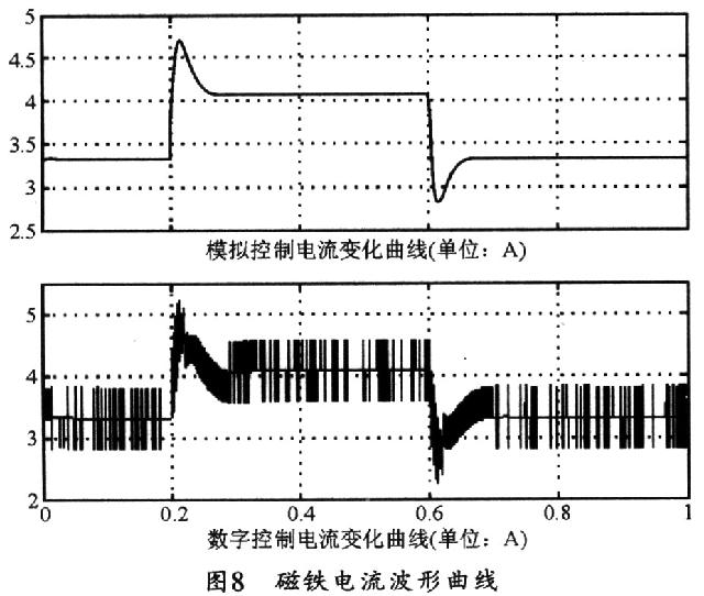 电流输出结果要缩小1000倍,图8所示是其磁铁电流曲线(单位A),其中实际额定电流值设定为3.3 A。上方为模拟控制,下方为数字控制。