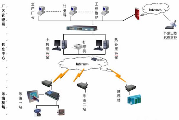 根据油井分布的地域特点与无线通讯技术发展的水平,油井远程监控系统考虑用CDMA/GPRS 或者数传电台通讯模式,系统主要由传感器、井口控制器SU、CDMA/GPRS (数传电台)通讯模块DTU、采油厂通讯机、实时数据库服务器、WEB服务器、监控浏览终端等组成。完整的油田监控系统应分为三层架构,分别是:采油现场的本地监控系统、信息中心的中心采集服务器、厂区内局域办公网络。