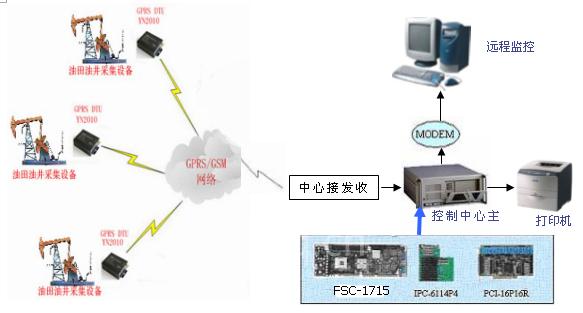 采油站本地监控由数据采集模块、GPRS通讯模块、无线遥测遥控主机(RTU)、现场采集主机、本地中心服务器组成,监测中心收发信机从空中接收到由油井遥控遥测主机的信号后,通过对射频信号放大、解调,恢复成数传信号送中心工业控制计算机处理计算,实时监测油井工况。当有异常时,中心工业控制计算机立即向油井遥控遥测主机发出控制命令,控制电机停机待修。这样可以实现整个系统的自动化运行,无人职守进行整个系统的监控。
