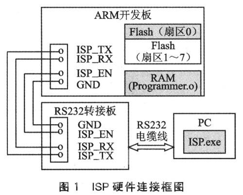 ISP方案的硬件连接如图1所示。RS232转接板用来将RS232电平转换为TTL电平,并通过ISP_EN引脚给ARM开发板提供信号,让其进入ISP状态。PC机上运行用VC语言编写的ISP.exe,该程序把需要烧录到F1ash里的.bin文件加密后发送到ARM开发板,同时把烧录的进度提示显示给用户。图1中的阴影部分具有固定的程序。
