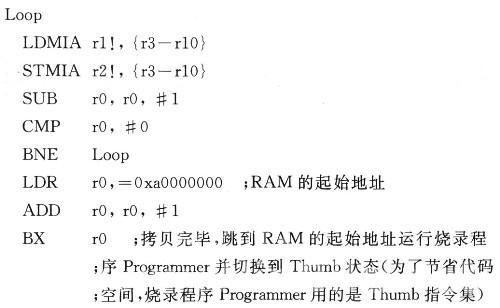 笔者把起到烧录Flash作用的程序单独作为一个工程编译、链接,生成.bin文件;然后把.bin文件转化成一个unsigned char型的数组,并把该数组放在一个单独的文件Programmet.c中;最后利用Scatter文件把Programmer.o定位在固定的地址空间(0x80001000~Ox80001fff,如图2所示)。这样一来,就可以编写汇编程序,把烧录程序Pro—grammer.o拷贝到RAM中,并让PC指针跳转到RAM中执行烧录。由于STR730没有外部Flash,要烧录Flash程序必须在RAM中运行,所以拷贝Programmer.o到RAM中是必需的。以下代码摘取自Startup.s。