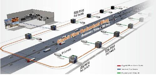 Moxa EDS-P510A-T工业以太网交换机直接连接公路两边的PoE IP摄像头。EDS-P510A-T除了具备PoE功能,每个PoE端口可提供高达15.4瓦的电源之外,还具备3个千兆以太网口,可以形成一个千兆以太骨干网,高带宽能力可以满足大量的视频传输。交换机还具有tag VLAN和IGMP snooping功能。tag VLAN功能在每个帧上做一个标记,然后将视频送入指定目的地。这样无需在每个物理端口配置视频流,从而实现更高的传输效率。此外,IGMP snooping则通过去除组播堵塞来降低网络中的通讯堵塞。由于公路较长,可安装SFP-1GLXLC-T即插即用小型收发器来建立光纤网络。该光纤网络将采用Moxa的Turbo Ring和Turbo Chain技术,在20ms内恢复网络自愈,确保网络不受任何故障的损害,以实现视频监控系统的稳定运行。此外,EDS-P510A-T可在-40至 75℃的温度下工作,可安装在没有空调和暖气的路边柜中。