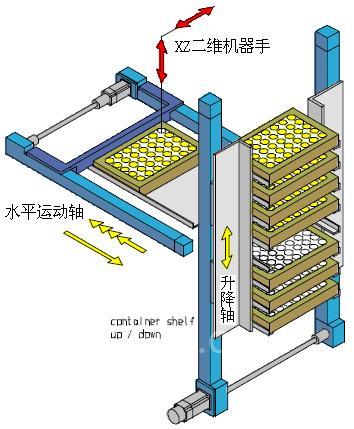 图1给出了一个标准的批量供货机构原理图,该图由拖盘摞升降部分,拖盘水平运动部分和一个二维XZ机器手组成。图1的例子中拖盘摞升降部分共有八个拖盘,由直线运动单元带动上下任意精确运动。工作时把最顶部第一个拖盘升高到比水平运动轴高出一定高度后停止,然后水平轴向第一个托盘运动,使所带的拖板处于第一个拖盘下面。然后升降轴下降使第一个拖盘处于水平轴的拖板上。将升降轴升高10mm, 接着水平轴向回运动把该托盘带到二维XZ机器手前面。XZ二维机器手先逐个搬运第一排的零件,搬运后处理完再放回原处。当一排零件被处理完后,水平运动轴再向前运动使第二排的零件处于机器手可以抓取的位置上。如此类推直到处理完最后一排的零件后,水平运动轴再把该托盘送回到升降轴的原来位置。然后处理下一个托盘的零件,如此进行下去,直到处理完最后一个托盘上的全部零件。