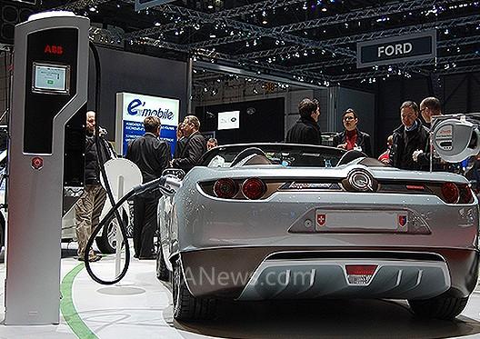 日内瓦国际车展电动汽车展区,Protoscar公司的电动汽车采用ABB直流快速充电站进行充电