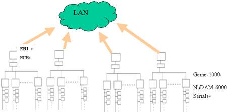 再与业着沟通并了解现场状况后,我们提出了使用GEC控制器的建议,我们先针对整体系统所需的管控点作一了解,再依据中控中心之信息系统(HoneyWell 之EBI的监控软件)所要求的信息反应时间为基础,将整个隧道监控系统划分为数十个子系统,每个子系统使用一台GEC控制器(凌华科技之GEME-1000)作为现场的监控中枢,而子系统周遭隧道现场的管控点则利用凌华科技之NuDAM-6000远程控制模块系列来进行数据采集,而GEME-1000即透过其串行埠(Com Port)与NuDAM-6000远程控制模块结合进行数据传输。