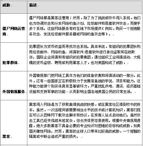 国家网络战计划是唯一对全范围目标构成的威胁,可能会损害美国的利益。这些威胁范围从政治宣传和低层次的骚扰网页,到造成生命损失和基础设施破坏的活动。在一系列网络威胁中,我们可以看到:只有政府资助的开发项目才能可持续,能构成广泛、长期损害美国关键基础设施的能力。
