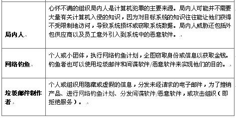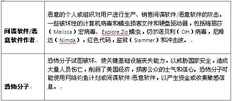 这个讨论的目的是要对故意威胁进行分类,与2001年6月21日由劳伦斯·格什温 -- 中央情报局国家科技情报总监 -- 在联合经济委员会记录声明的言论相一致。对象可能包括:各国政府、恐怖分子、工业间谍、有组织的犯罪团伙、黑客活动家和黑客。行动可能包括:间谍活动、黑客入侵、身份盗窃、犯罪和恐怖主义。