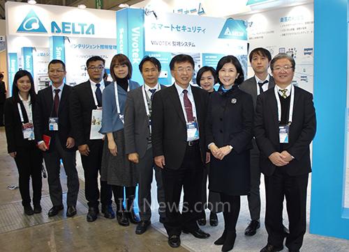 台达于日本智能建筑博览会展出最新楼宇自动化解决方案。台达日本分公司总经理柯进兴(右三)、台达品牌长郭珊珊(右二)、台达日本分公司楼宇自动化解决方案事业处部长鎌田博之(右一)与团队于展区合影