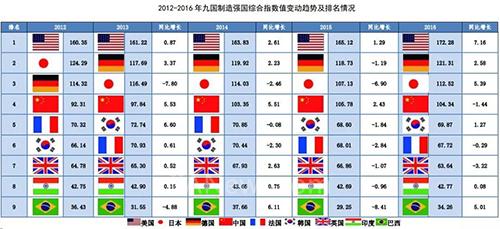 报告比较了各国制造强国综合指数近两年的变化情况,结果显示,2015—2016年各主要国家制造强国发展进程整体向好。其中,美国持续大幅领跑各国,制造业综合优势地位进一步巩固;德国稳步前进,工业4.0战略成效显著;日本触底反弹,其规模受日元汇率反转上升影响较大;而人民币兑美元汇率大幅下滑、国际市场不景气导致出口下降等因素同时作用于中国制造业,造成2016年中国指数首次下滑。同时,综观2012—2016年五年间,各国制造强国综合指数均存在不同程度的波动,情况差异较大。在此情况下,中国是指数值增长最大的国家,总体上符合制造强国战略的预期。