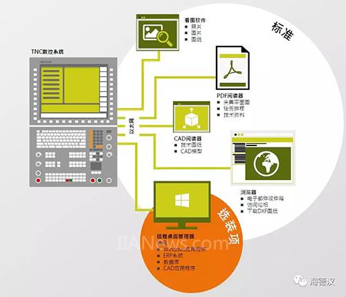在数控系统与公司内网之间,只需要以太网连接和必要的网络访问权限。那么,车间数控系统将能使用公司内网中的大部分数据:TNC数控系统的标配功能包括CAD阅读器、PDF阅读器、看图软件和网页浏览器 Mozilla Firefox。用户可以进行许多操作,例如:直接在数控系统屏幕上查看工件图纸、工艺过程卡片、刀具清单、质量文件和数控加工程序,同时可查看工作邮件,其他文档,公司内部ERP系统等,实现无纸化车间协作。查看图纸,使用全部基于网页的应用程序,例如电子邮件收件箱或相应的文档资料以及ERP系统。
