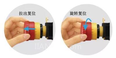 ● 按下急停保护, 拉出/旋转复位的双操作复位功能(IEC 60947-5-5, 6.2);