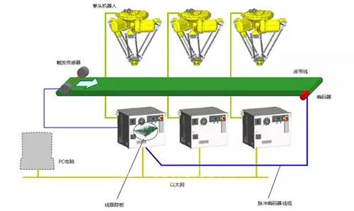 2. 传送带。传送带的速度以及其运行的稳定性将会影响系统跟踪的精度。通常来说,传送带运行的速度越低,机器人跟踪精度以及视觉识别精度越高。因此,通过增加产品在传送带上的分布密度,可降低传送带的运行速度,从而达到提高精度的目的。