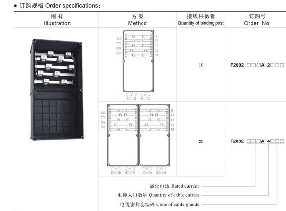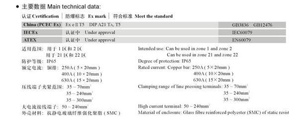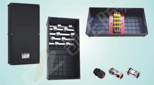 全塑防爆电缆终端箱内装三相五线端子排,额定电流分250A、400A、630A三种,专制压线端子夹紧范围为35-300mm,还可选用大电流接线端子50-240mm,根据要求选用不同的电缆密封套。