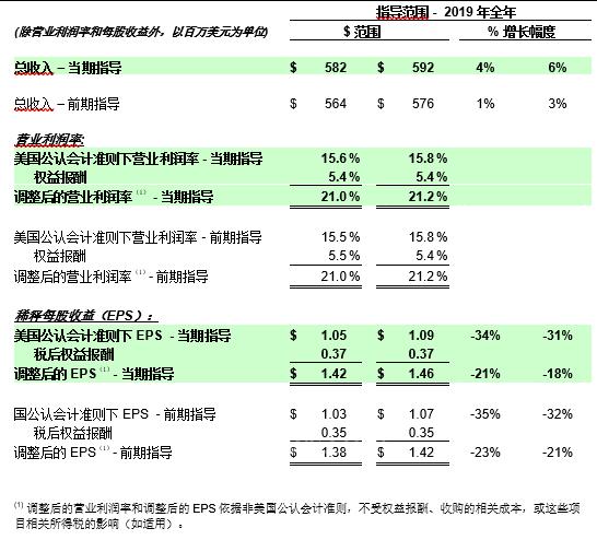 · 按照非美国公认会计准则调整,2019年第一季度稀释每股收益为0.41美元,而2018年第一季度为0.37美元。