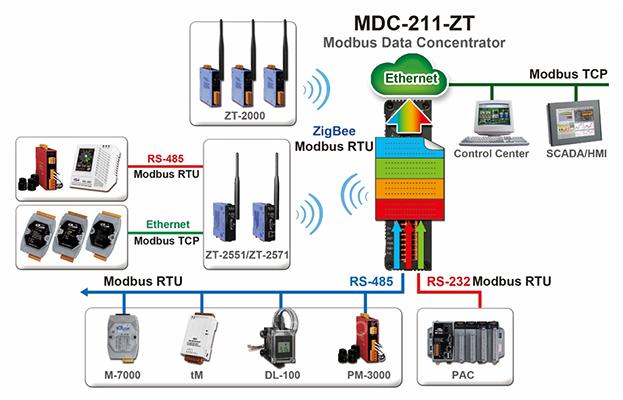 MDC-211-ZT为泓格科技所开发的Modbus数据集中器,具备以太网络、ZigBee无线通信、RS-232与RS-485通讯界面,能将Modbus RTU设备链接到以太网络中;MDC-211-ZT会依据使用者自定义的命令表,依序读取Modbus RTU设备的数据,并将不同Modbus RTU设备的数据整合为连续地址的格式,使得远程监控主机可从以太网络链接到MDC-211-ZT,一次存取多个Modbus RTU设备的数据。